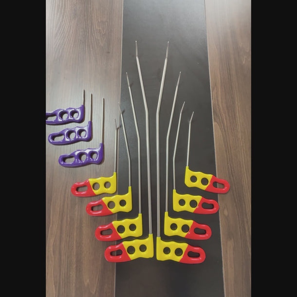 Bu set, teknisyenlerin kapı sacları, direkler, tavan rayları ve çamurluk kenarlarının arkasında her iki yönden de rahatça çalışmasını sağlayan 8 adet sağ ve sol çift kıvrımlı (double-bend) geometriye sahip parça içerir. Çift kıvrımlı tasarım, daha iyi açı kontrolü ve metalle daha temiz temas sağlayarak, daha pürüzsüz ve doğru bir göçük düzeltme işlemi sunar.